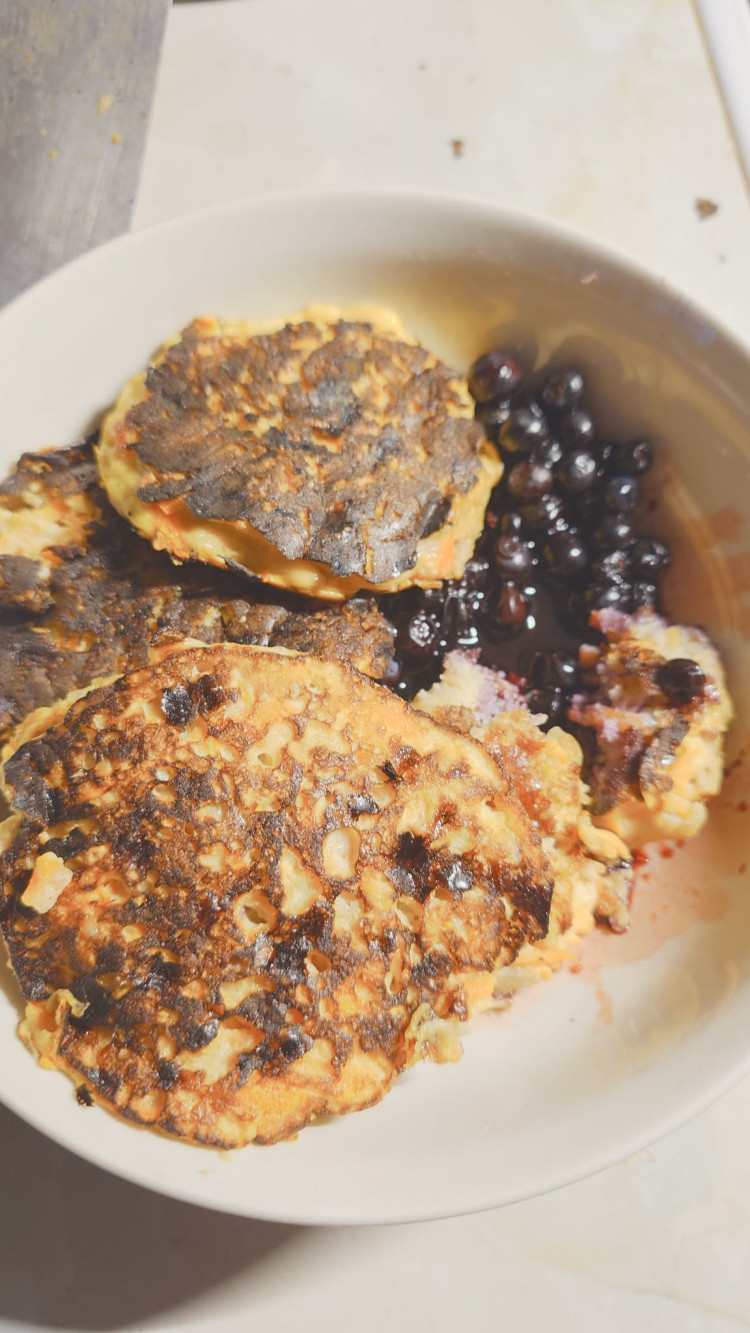 Lite matigare bananpannkakor. 2 ägg, 1 banan, 1/2 dl havregryn, 1 riven morot, 2 msk supermini keso, lite salt.