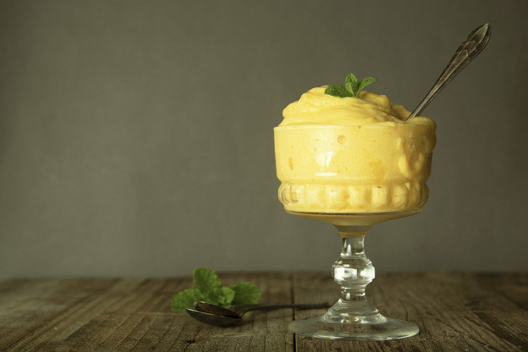 - Mixa den frysta mangon med kvarg och vaniljpulver.