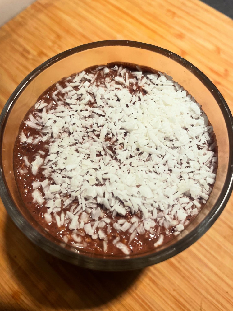 - Häll upp i glas eller skål och ställ in i kylskål över natten. Toppa med riven kokos innan servering.