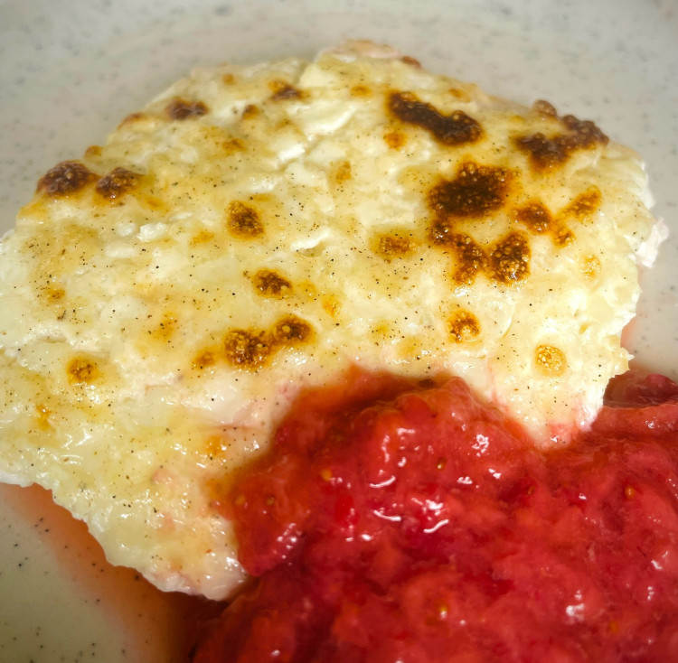 - Bland ihop keso, ägg och vaniljpulver. Häll ner i en liten ugnstålig glasform.